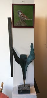 Een beeld van Leon Veerman met daarboven een musje geschilderd door Diana den Boon.
